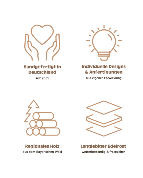 Unsere mit Liebe zum Detail gefertigten Metalldesigns überzeugen durch ihre ausgezeichnete Qualität und einzigartige Optik im Edelrost-Design.